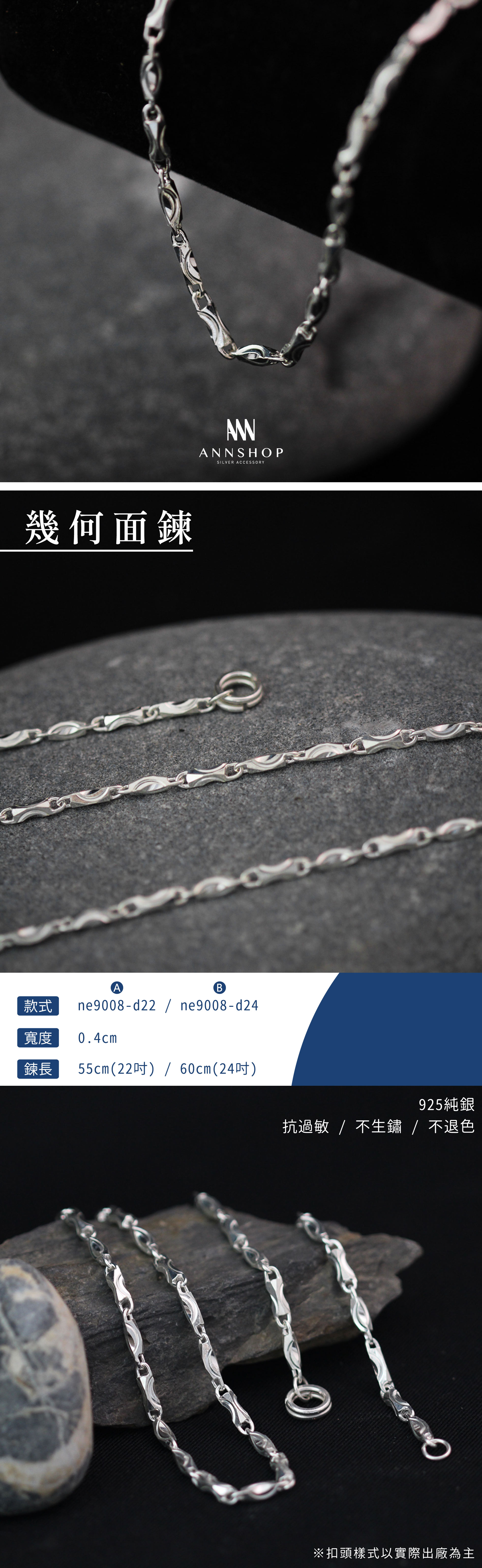 | 925純銀 | A款 粗0.4 / 長 55 cm (22吋) B款 粗0.4 / 長 60 cm (24吋) (以文具尺測量,些微誤差±0.5cm為正常值) | 項鍊1條 |
